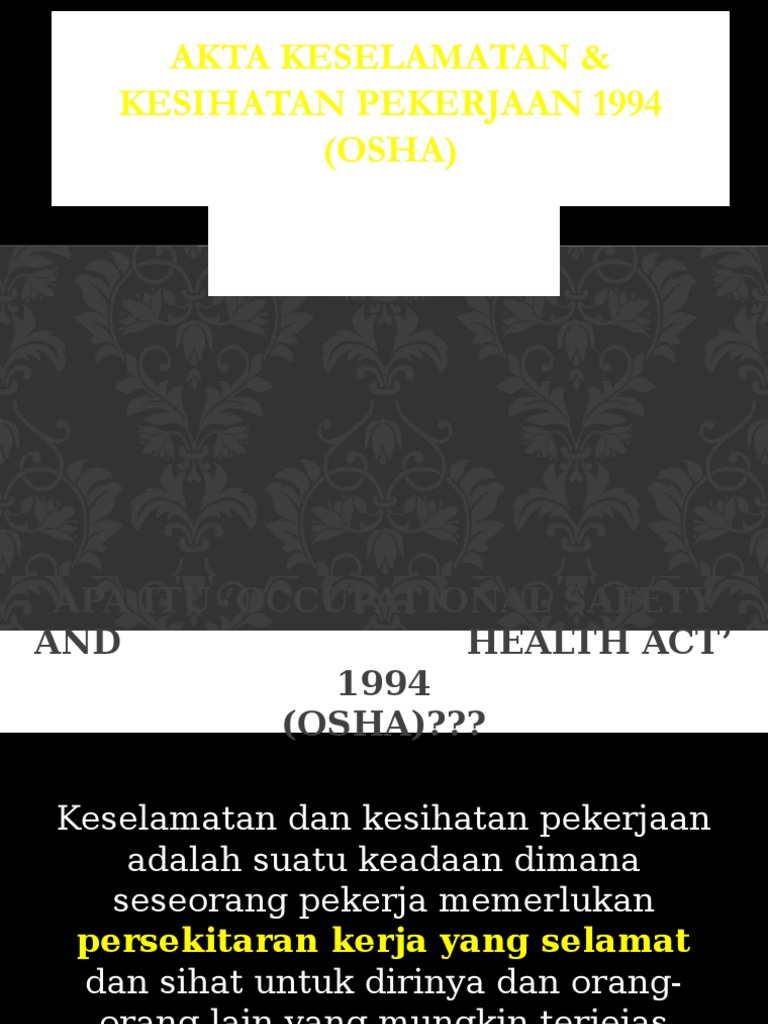 Profesyen di bidang keselamatan dan kesihatan pekerjaan atau osh di malaysia kini memerlukan ramai tenaga pekerja mahir. 23/1992 mengatur mengenai pertanyaan mengenai keselamatan dan kesehatan kerja di indonesia resiko kecelakaan kerja bisa terjadi kapan saja. Akta keselamatan dan kesihatan pekerjaan 1994 (akta 514) yang telah dikuatkuasakan sejak tahun 1994 memfokus ke arah pembentukan sistem ia menyediakan rangka perundangan untuk memupuk, merangsang dan menggalakkan mutu keselamatan dan kesihatan yang tinggi di tempat kerja. Pekerja akan berasa aman dan selesa untuk bekerja di sesebuah organisasi yang majikannya. Akta keselamatan & kesihatan pekerjaan.