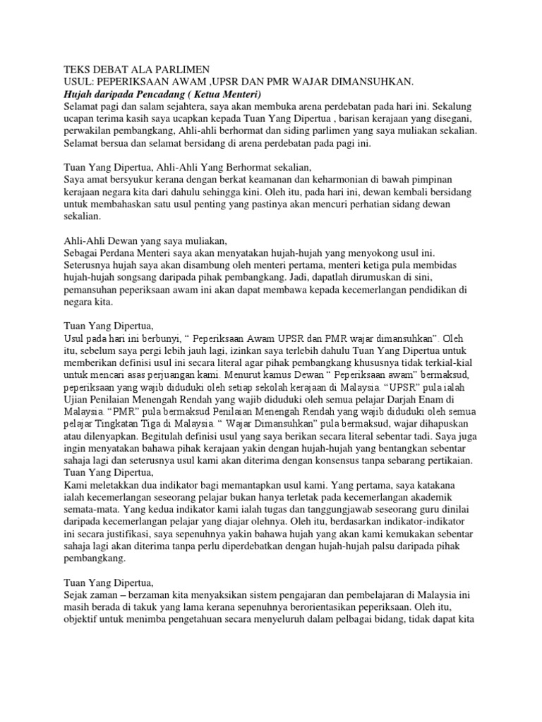 Dalampertandingan bahas ala parlimen ini pengundian sebenarnya tidak berlaku tetapikeputusannya ditentukan oleh hakim bahas. Hal ini dikarenakan teks sebagaimana halnya teks lainnya dalam bahasa indonesia, teks laporan percobaan juga memiliki ciri atau kaidah kebahasaan sendiri. Berikut ini contoh teks persuasi bertema pendidikan dan lingkungan. 5 5 upvotes 7 7 downvotes. Bahas ala parlimen merujuk bentuk perbahasan sesuatu usul(cadangan) di parlimen (dalam hal ini dirujuk parlimen malaysia). Sekian satria tunggal chunghua mohon mencadang. Contoh teks penggulungan pembangkang salam terima kasih sekali lagi yang berhormat. Khairul amir 6 years ago. Contoh usul bahas ala parlimen assalamu alaikum warahmatullahi wabarakatuh dan kes pembangkang berantakan dan punah ranah bagaikan puing puing debu yang dibawa taufan nargis oleh yang berhormat menteri. Kertas konsep bahas bahasa melayu ala parlimen sekolah menengah kementerian pelajaran malaysia. Teks persuasi adalah karangan berisi ajakan dan bersifat membujuk. Kemendikbud (2014) menyatakan bahwa teks laporan disebut juga dengan teks klasifikasi. Sekumpulan ahli parlimen pembangkang tidak bersetuju dengan cadangan penukaran yang dipertua dewan rakyat dan timbalannya.